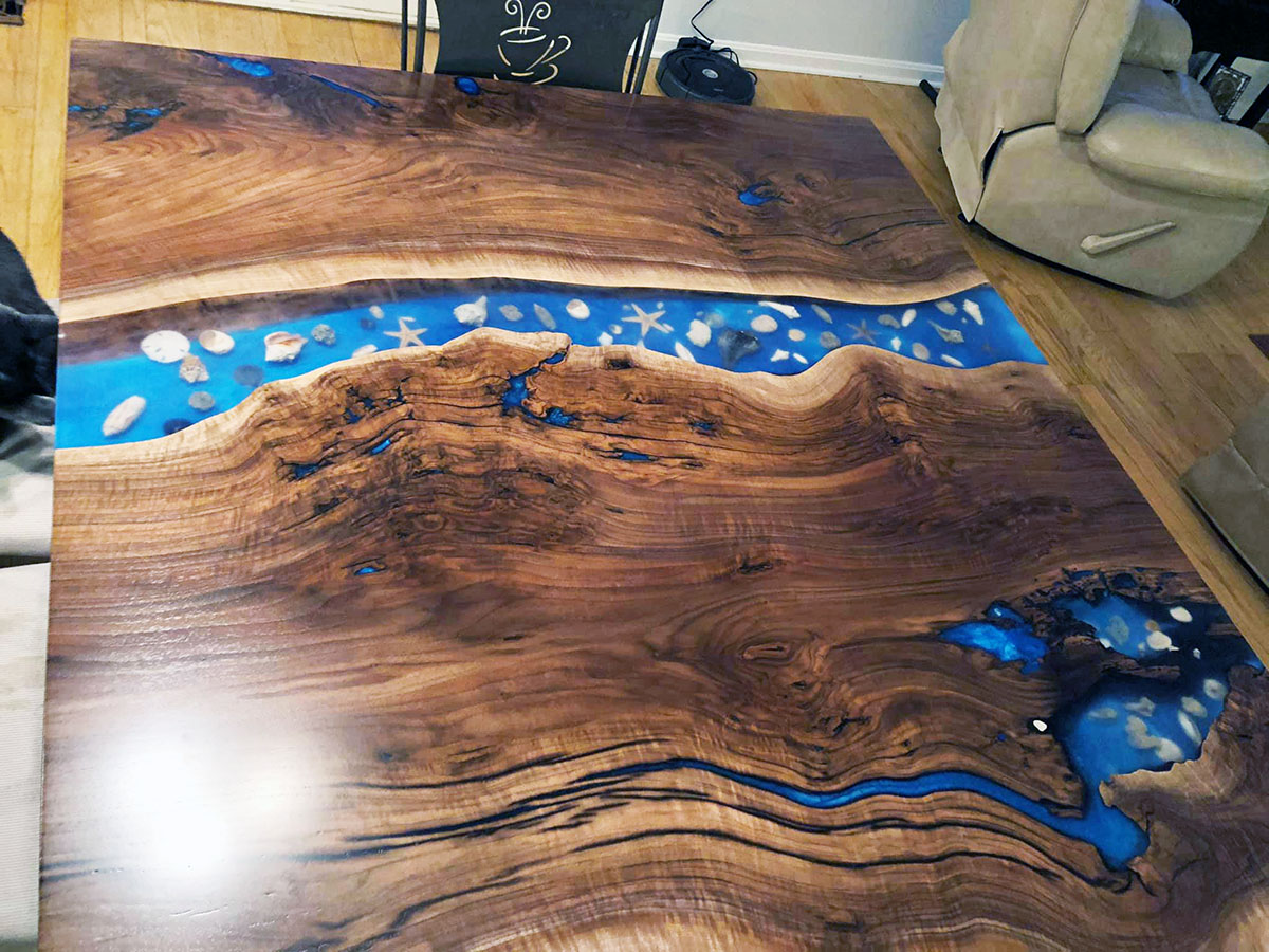 Live Edge Walnut Blue River Table With Embedded Seashells